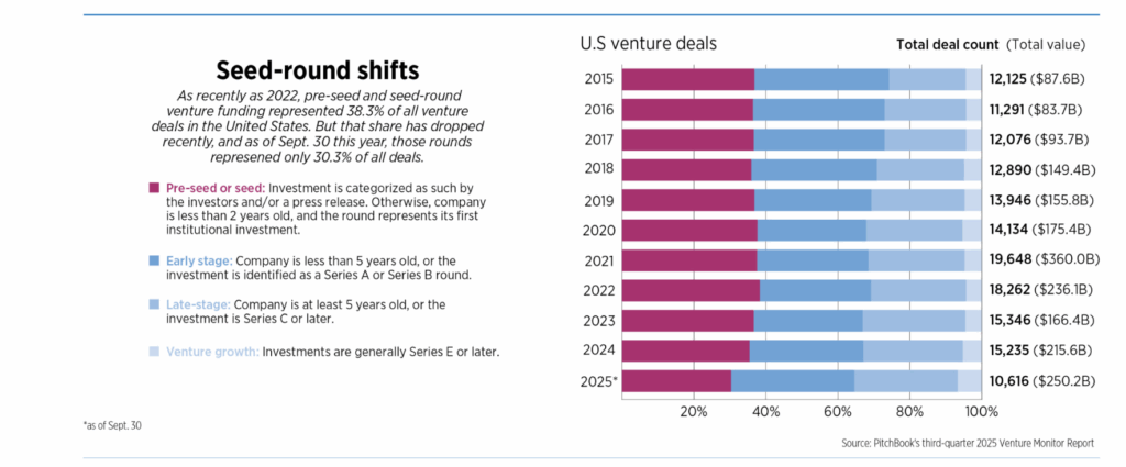 PitchBook’s third-quarter Venture Monitor Report, released last month, shows that the earliest-stage venture investments—the pre-seed and seed rounds—make up a smaller percentage of total venture funding this year than they have in the past few years.